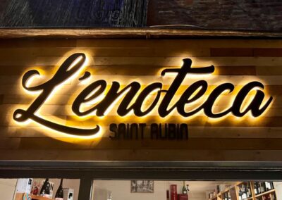 👉 Exemples : enseignes rétro-éclairées, lettres découpées en bois ou métal, logos lumineux personnalisés.